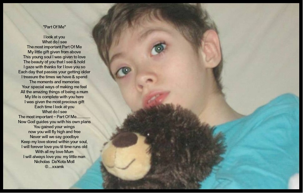 He had a special life just as special as he was... Nicholas' I want to tell you, you deserve all the happiness and to be whole in heaven. I so want that for you. To be free. My heart will hurt, not being with you like we've always been. I want you to haunt me in your special amazing way with signs. I will feel you always there. Much love Nicka Nick from me and all who love you extra from me, I will deeply love & miss you Nick. I can't even put into words how much I truly will. I love you. Thank you with all that I am, for being all that you were. You impacted my life in means and ways I will never ever forget. You were my greatest teacher to see and feel thru your eyes and life. You were the Ultimate gift. It has been an amazing journey I will cherish & treasure all of my life. God bless you Precious little soul. I will keep you with me always !!!!!!!!!!! Much love and đź©¶I LOVE YOU NICHOLASđź–¤ xoxo Mum Anyone whom wishes to comment on your memories with Nicholas please do & Thank you ! xo